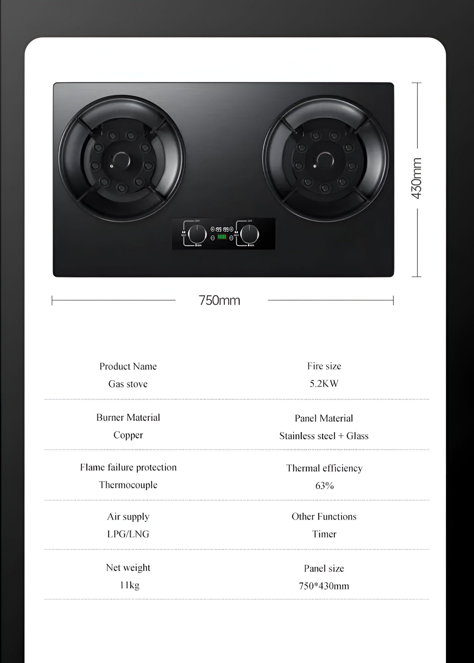 quemadores potentes: esta cocina a gas está equipada con 2 quemadores sellados de alta eficiencia. Los 2 quemadores incluyen uno de 5,2 KW (quemador izquierdo) y otro de 5,2 KW (quemador derecho). Estos múltiples quemadores potentes pueden satisfacer sus diferentes necesidades de cocción.
