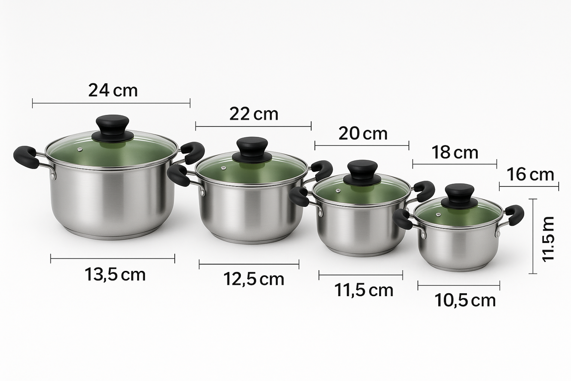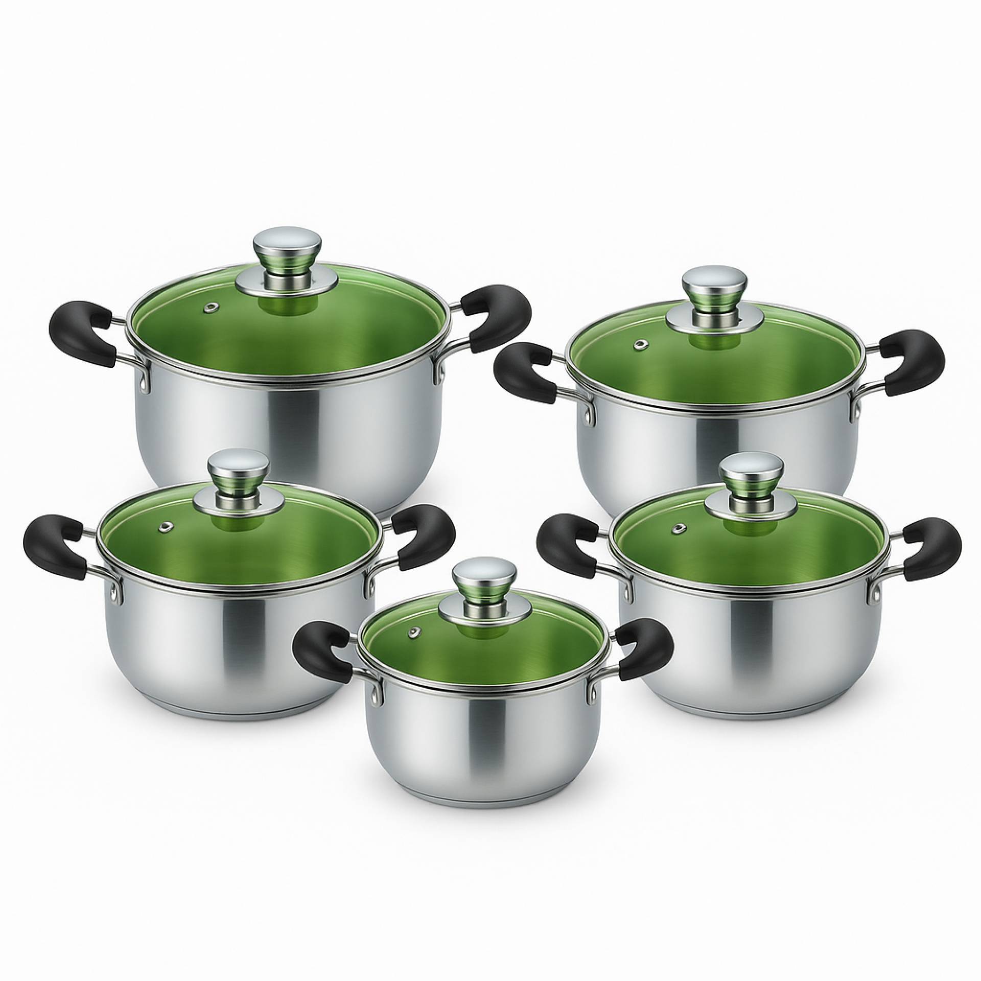 Renueva tu cocina con este completo set de ollas de acero quirúrgico, diseñado para brindar durabilidad, resistencia y una cocción uniforme. Cada olla incluye tapa de vidrio templado color verde, aportando un estilo moderno y elegante a tu cocina.