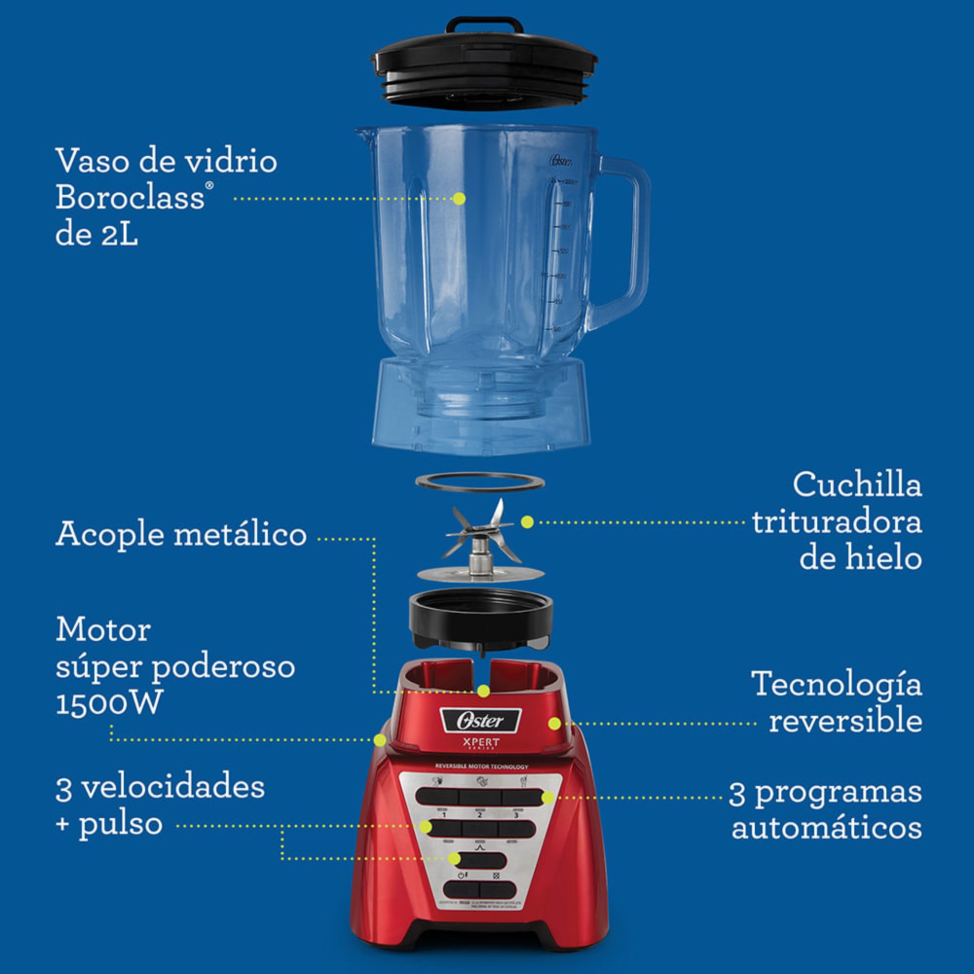 Desde el lanzamiento de la primera licuadora de alto rendimiento Oster® Xpert Series®, se ha convertido en la preferida de consumidores. Ahora, presentamos una nueva generación de la licuadora de alto rendimiento, que cuenta con un potente motor con 1500 W de potencia*****, tres programas inteligentes para licuar, procesar alimentos y preparar malteadas al toque de un botón; 3 funciones manuales y una función de pulso; Cuchilla dos veces más grande** y la tecnología de motor reversible, que te permite preparar batidos nutritivos fácilmente, con frutas y vegetales prácticamente enteros o hasta hacer masas y helado. El sistema viene con una Guía de nutrición inteligente con consejos y 70 recetas de desayunos, almuerzos y comidas, con opciones más frescas, saludables y nutritivas. Es la aliada para dar el paso a una vida más sana.