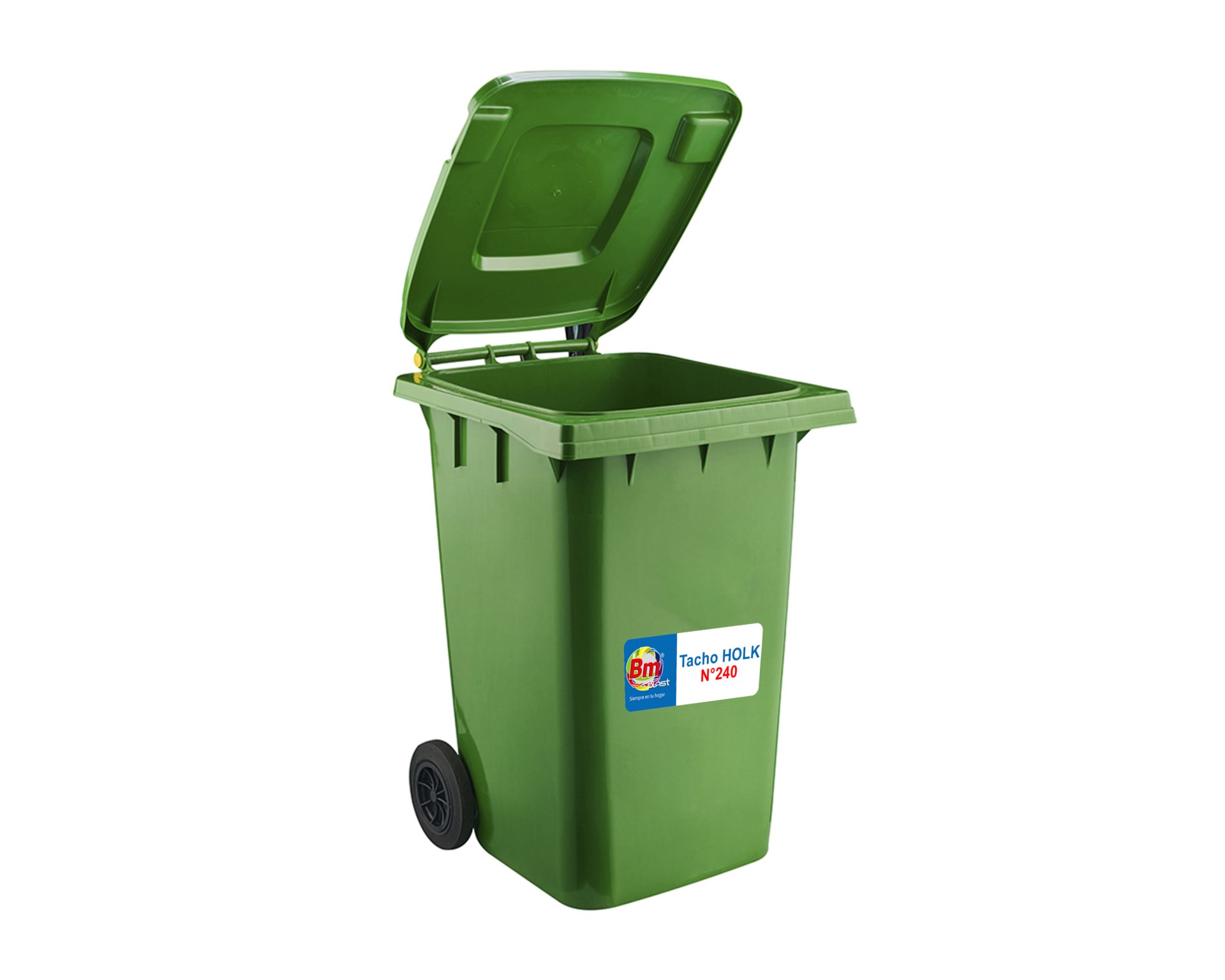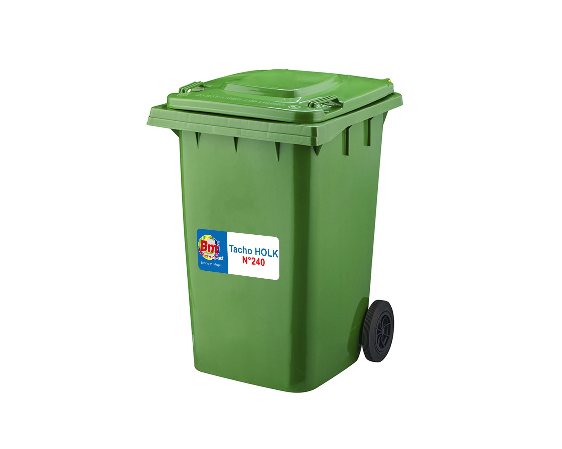 Tacho Holk de 240 litros fabricado en polietileno de alta densidad (PEAD) mediante proceso de inyección. Resistente a rayos UV, productos químicos y condiciones climáticas extremas. Cuenta con tapa abatible, eje metálico galvanizado y dos ruedas de goma maciza para un manejo eficiente. Dimensiones estándar compatibles con sistemas de recolección automatizados.